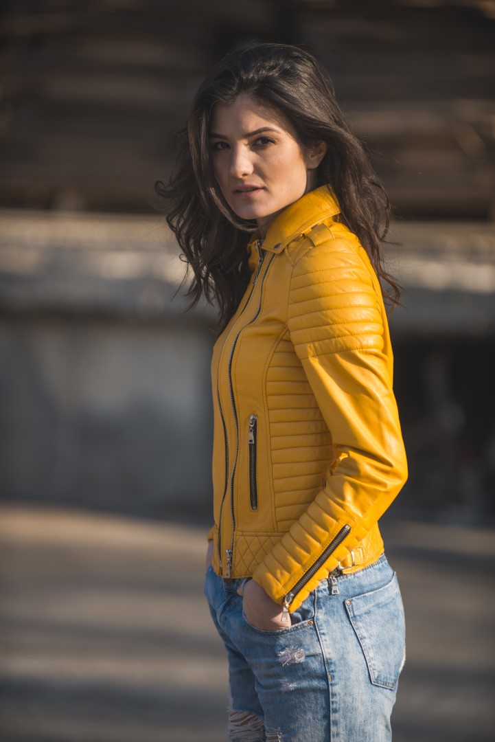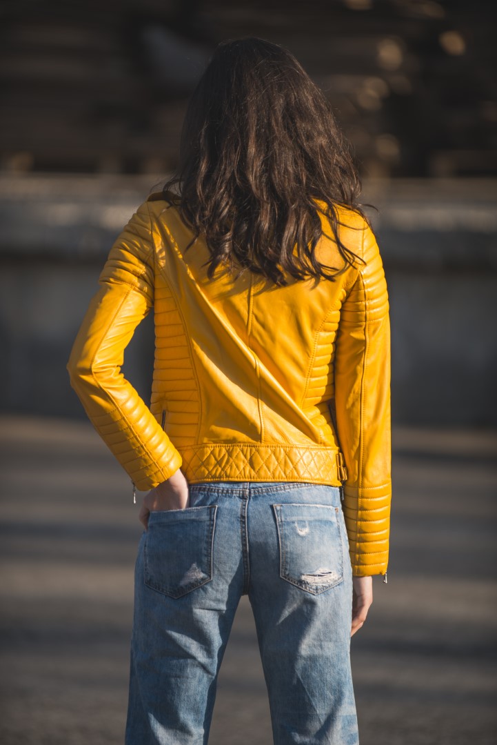 Trendi kroj bajkerske kožne jakne u savršeno vedroj žutoj boji. Udahnuti će novi sjaj u Vaše svakodnevne modne kombinacije i učiniti ih neodoljivima.